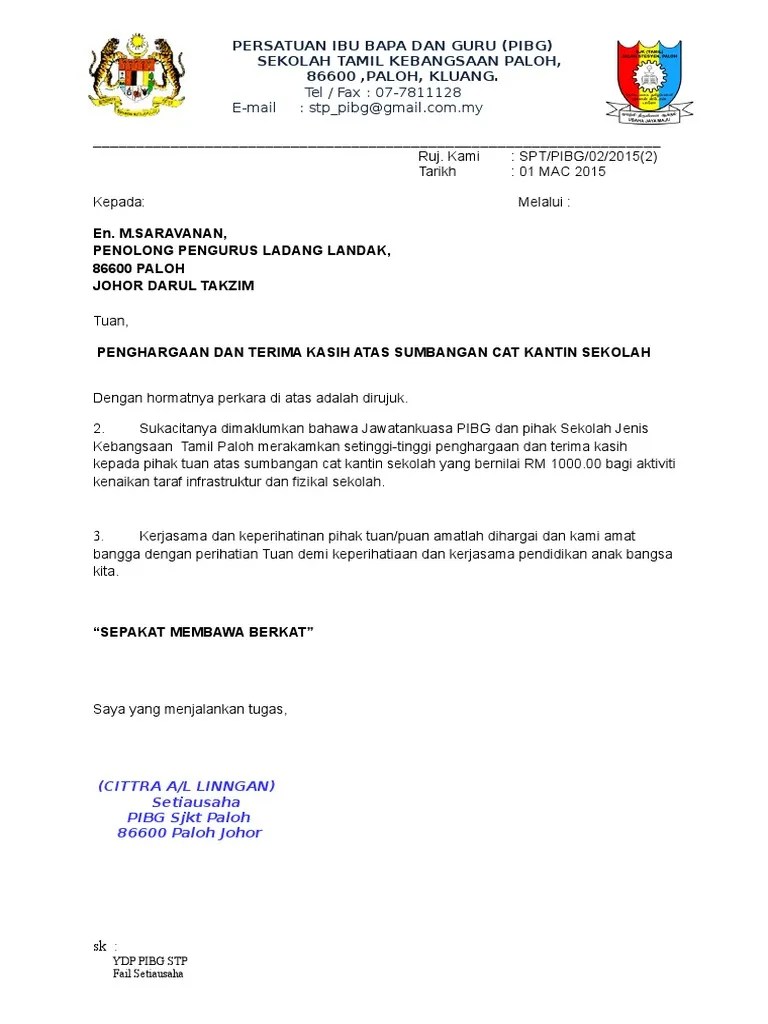 Sumbangan telah kami terima sebesar rp. Penghargaan dan terima kasih kepada pihak tuan atas sumbangan wang tunai. Penghargaan contoh surat terima kasih atas kerjasama. Penghargaan atas sumbangan tajaan majlis hi tea untuk mengisi tabung pibg smpk vokasional indahpura, kulaijaya, johor. Contoh surat terima kasih untuk sumbangan picture posted ang uploaded by admin that kept inside our collection. Kumpulan contoh surat terima kasih atas sumbangan yang benar 2019. Surat penghargaan dan terima kasih. Adalah saya dengan hormatnya merujuk .